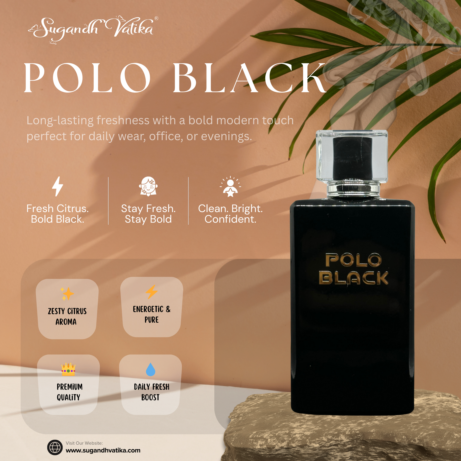 Cool, bold, and timeless — Polo Black by Sugandh Vatika is a sophisticated fragrance crafted for the modern man who stands out with effortless confidence. Inspired by rich woody and aromatic notes with a hint of spice, this scent opens with crisp energy that refreshes your senses and sets a bold, charismatic tone for every moment.